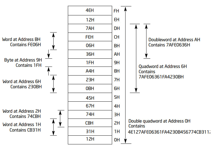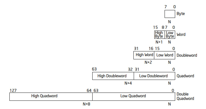 IA-32 基本的数据类型分为字节 (byte, 8 bit)、字 (word, 16 bit)、双字 (dword, 32 bit)、四字 (qword, 64 bit)、双四字 (double qword, 128 bit) 等: