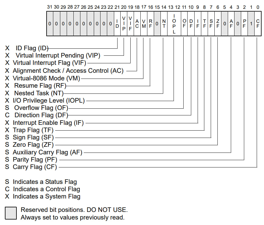 EFLAGS 寄存器有 32bit,包含了状态、控制和一系列系统信息的标志。如图所示: