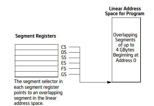如果操作系统使用的是平面内存模型,那么段寄存器重叠指向线性地址空间的 0 的位置。