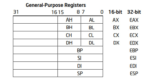 通用寄存器包括了 EAX,EBX,ECX,EDX,ESI,EDI,EBP,ESP。它们可以用于逻辑和算数运算、地址运算和作为内存指针。