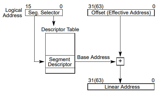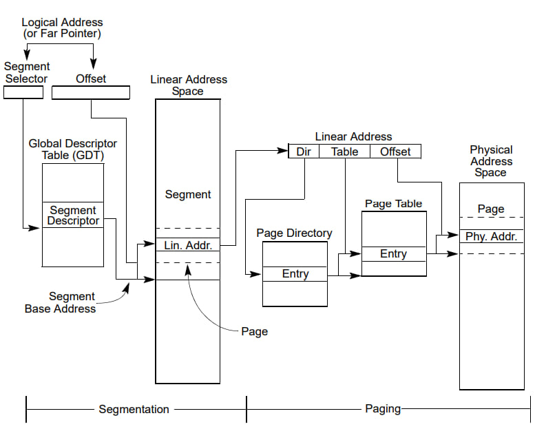 这样子,系统中的所有段都分布在处理器的线性地址空间里面,为了去寻找某个段内的一个字节,我们需要一个逻辑地址 (logical address, or far pointer)。逻辑地址包括了一个段选择器 segment selector 和一个偏移。段选择器是每个段唯一 (unique) 的标识符,它提供一个描述符表 (descriptor table),如 GDT (global descriptor table,全局描述符表) 或者上的偏移,指向了上面的一个段描述符 (segment descriptor) 的数据结构。