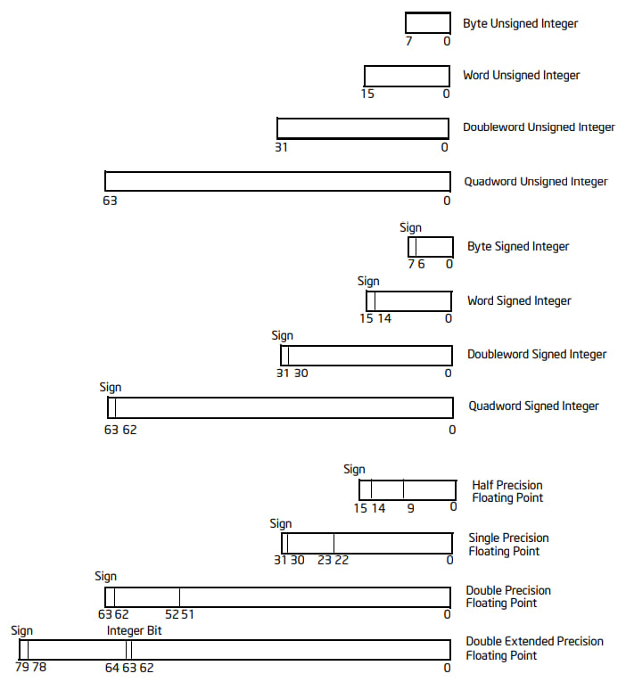 一些指令支持特殊的数据类型,包括整数(有符号的和无符号的)和浮点数(32 bit 单精度、64 bit 双精度),它们的结构如图所示: