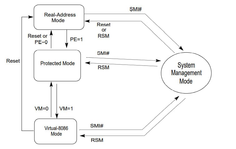 IA-32 指令集支持三种基本的工作模式:保护模式 (protected mode),实模式 (real-address mode) 和系统管理模式 (system management mode, SMM)。