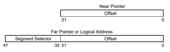 近指针是 32bit 长度的段上偏移(有效地址),一般在平面内存模型或者已经明确了某一个段的情况下使用。而远指针是一个逻辑地址,包含了一个 16 bit 的段选择器,用于精确地访问某个地址。