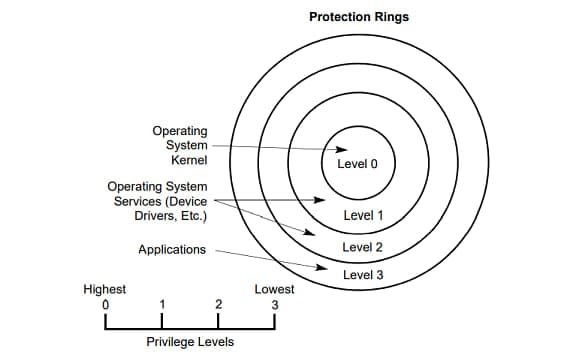 为了提高操作系统的可靠性,IA-32 指令集架构有四个权限级别,分别是 ring 0~3,数字越低级别越高。