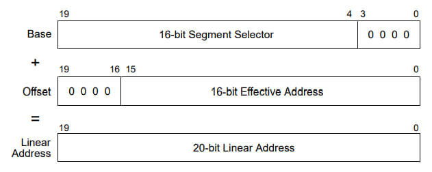 在实模式下,处理器直接使用 segment selector 来形成地址。处理器将段选择器 segment selector 左移 4 位形成 20bit 的基址,并将其和偏移值相加得到物理地址。如图所示。