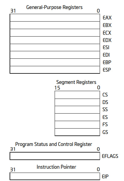 IA-32 指令集下,用于基本的程序执行的寄存器分为四个类型: