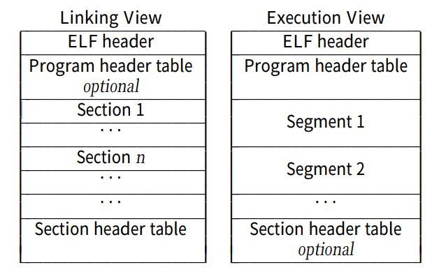 对象文件参与程序链接和程序的执行,对于这两件事情,对象文件格式提供了两个并行的视图也就是链接视图和执行视图: