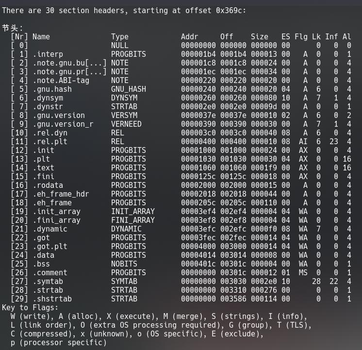 以一个程序( readelf -S )为例,其中包括了下面这些节:
