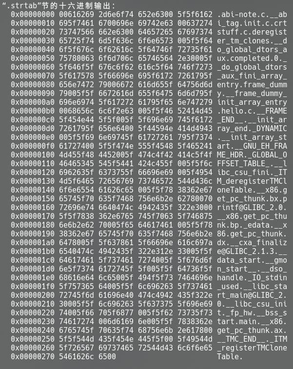 通过 readelf -x 命令读取字符串表 .strtab 所在的节,能够得到下面的信息:
