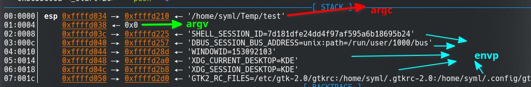 先前在栈顶的位置上是 argc (0x1),被弹出之后,现在剩下 argv 和 envp 。