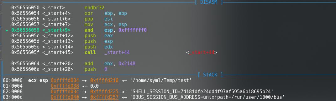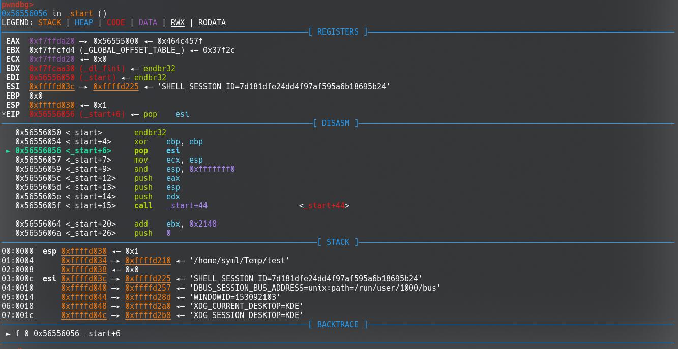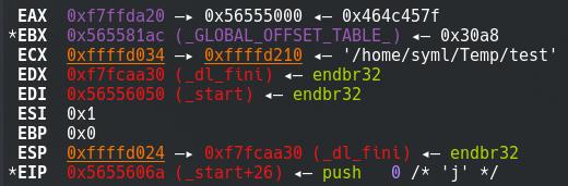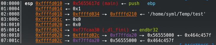 图片是在执行 pop esi 的上一步操作,此时 esi 的值是之前 dl_start 调用留下的,指向栈上的一个位置。而 EBP 的值已经被设置为了 0x0。
