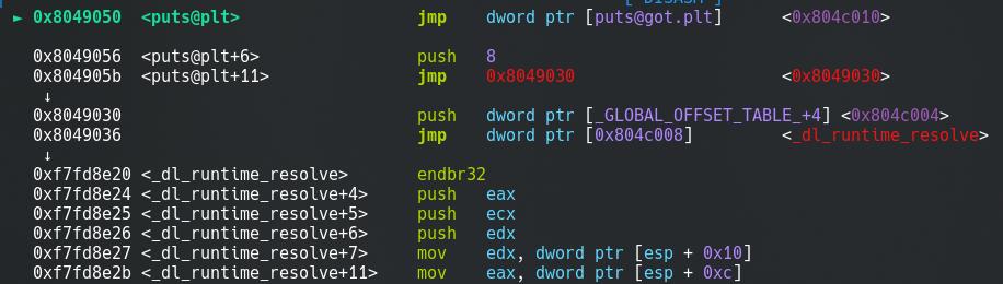 可以看到程序会直接跳转进入了 puts 函数中执行,并不需要再进行一次 _dl_runtime_resolve 的操作。