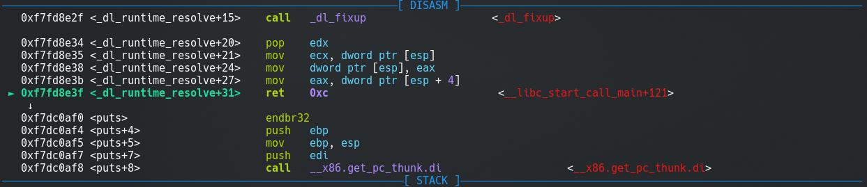 完成这个步骤之后,解析过程完成。通过 GDB 调试可以看到,执行完函数 _dl_fixup 之后, EAX 的值就是 puts 的实际地址: