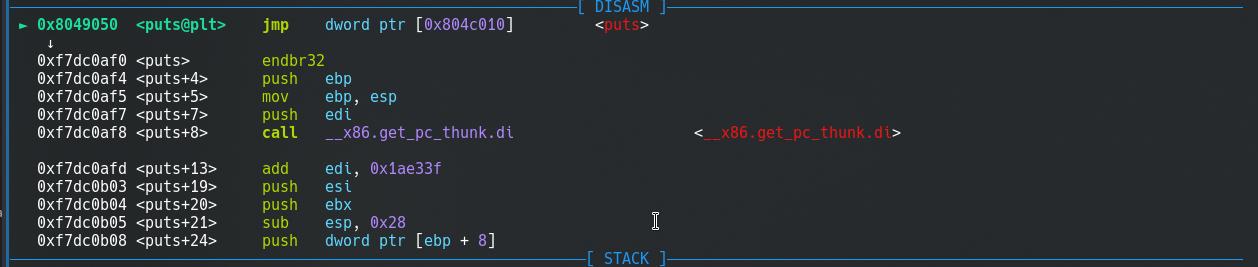 ► 0xf7dc0bfa <puts+266> ret <0x804919f; main+41>