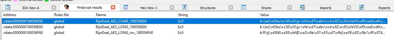 这里找到了 AES 的密码学组件,接下来顺着调用关系向上寻找。以 RijnDael_AES_LONG_inv_180056F60 为入手点,它在函数 sub_180007320 中被使用。