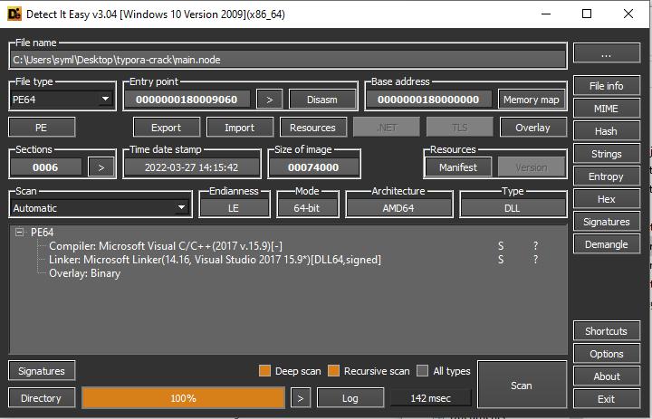 那下面要看的也就是 main.node ,拖进 detect it easy 可以看到这是个 64 位的动态链接库。