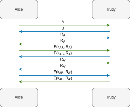 在第二个会话中,Alice 收到请求后会给 Trudy 发送一个随机数 作为挑战,而 Trudy 则直接将这个随机数作为第一个会话中自己对 Alice 的挑战发送会 Alice。不知情的 Alice 将自己加密后的 作为第一个会话的应答发送给 Trudy,使得 Trudy 能够完成第二个会话的挑战。