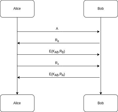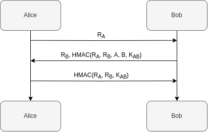 首先 Alice 向 Bob 发送了自己的身份 请求建立连接。Bob 在收到 Alice 的请求之后就会去生成一个随机数 发送给 Alice,Alice 需要用共享的秘密 去对这个随机数进行加密,得到 作为结果 发送给 Bob。经过了这个过程,Bob 就能够确定 Alice 的身份。