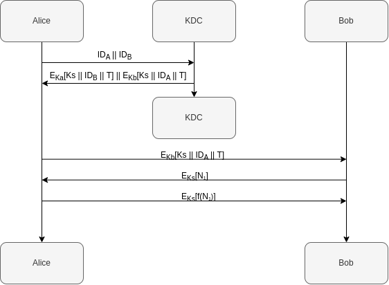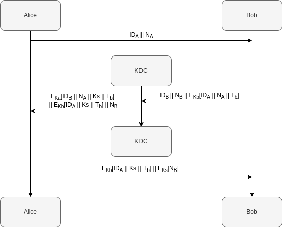 - Alice 解密信息之后得到会话密钥,并将 发送给 Bob。Bob 在解密这个信息之后能够得到 Alice 的身份和会话密钥,并能够解密 Alice 发来的消息。