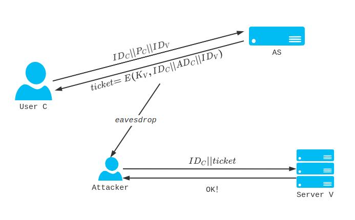 首先最致命的问题在于,用户 C 发送给 AS 的口令是明文传输的,一个攻击者可以去窃听这个消息从而获得用户 C 的口令。