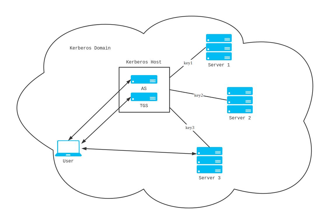 在一个使用 Kerberos 的网络中,一般有一台 Kerberos 服务器和若干的主机和客户端。Kerberos 服务器存储了所有用户的身份信息和口令,同时和所有的服务器分别共享了一个不同的密钥。这整个体系就是一个 Kerberos 域。