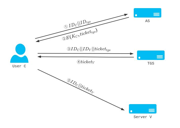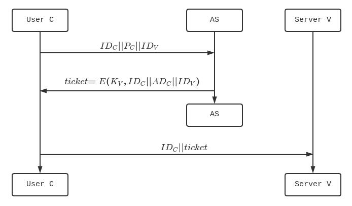 在这个协议中,用户 C 首先将自己的身份信息IDC、口令PC 和需要访问的服务器身份信息IDV 发送给 AS。接下来,AS 生成了一个ticket=E(KV,IDC∣∣ADC∣∣IDV) 发送给 C,其中ADC 是用户 C 的网络地址。当用户 C 需要去访问服务器 V 的时候,他需要把自己的身份和凭证一起发送给服务器 V。