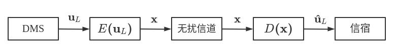对于信源输出序列{uL}={u1,u2,...,uL},满足其中元素都在字母表A=[a1,a2,...,aKp1,p2,...,pK] 中。找到一个到码字集合B={b1,b2,...,bD} 上的码字序列{vN}=(v1,v2,...,vN) 的映射,这个过程也就是信源编码。