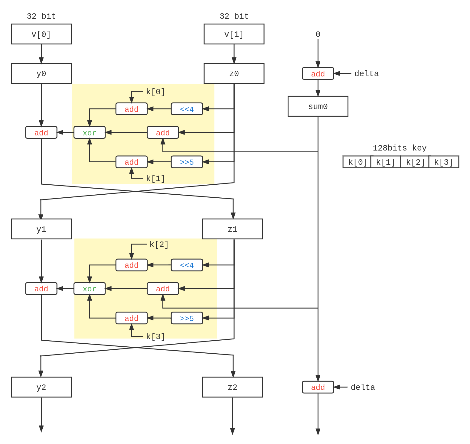 TEA 的密钥记为,在奇数轮,使用 作为轮密钥,在偶数轮则采用 作为轮密钥。奇数轮和偶数轮合并成一轮,这样总计是 32 次迭代。第 轮中,对块 进行下面的操作: