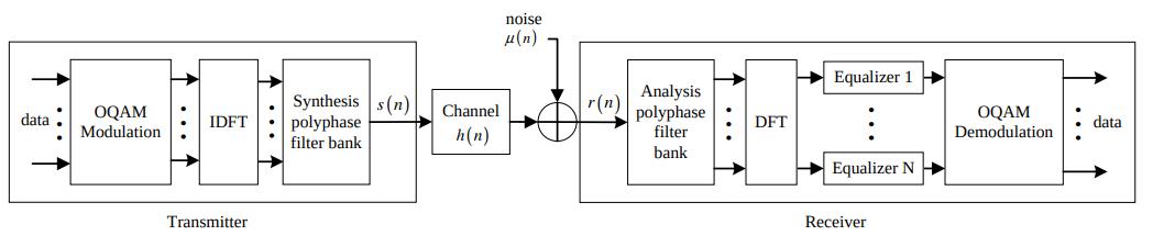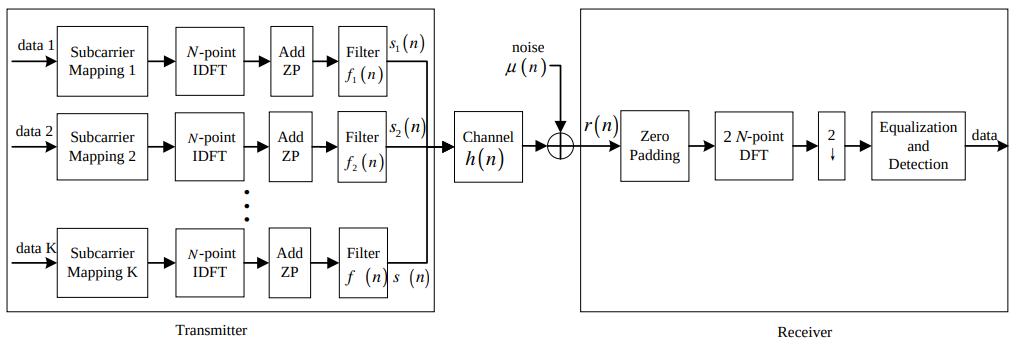 是载波 上的符号向量,首先我们对其进行一个 点的离散傅立叶变换,得到频域上的符号信号。接下来,我们将这个信号乘以上采样矩阵 得到长度 的序列,这里的 是一个重叠系数,这一步具体的效果我们后面代码实现的部分说。接下来矩阵 是一个对角矩阵,其对角线是这个子载波使用的滤波器相应,这一步相当于进行了脉冲整形。然后,通过乘以矩阵,我们将这个频域上的信号映射到长度为 的频域信号中子载波 所在的位置上。最后,进行一个离散傅立叶逆变换,我们将频域信号转换回时域。
