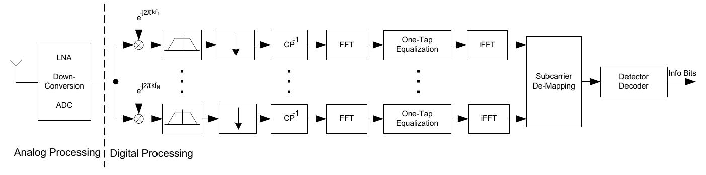 其中 是无线信道在 处的频率响应, 为加性噪声。这样信道引发的失真是信道频率响应的乘积,因此 OFDM 信号的检测也比较简单。