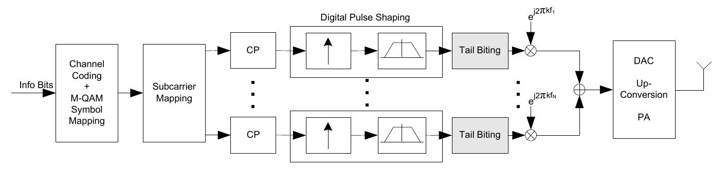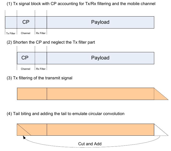 这一步可以有效降低 OOB 泄漏。而 GFDM 使用了一种 tail biting 的方式来减少 CP 的长度,这个后面会来看它的实现。