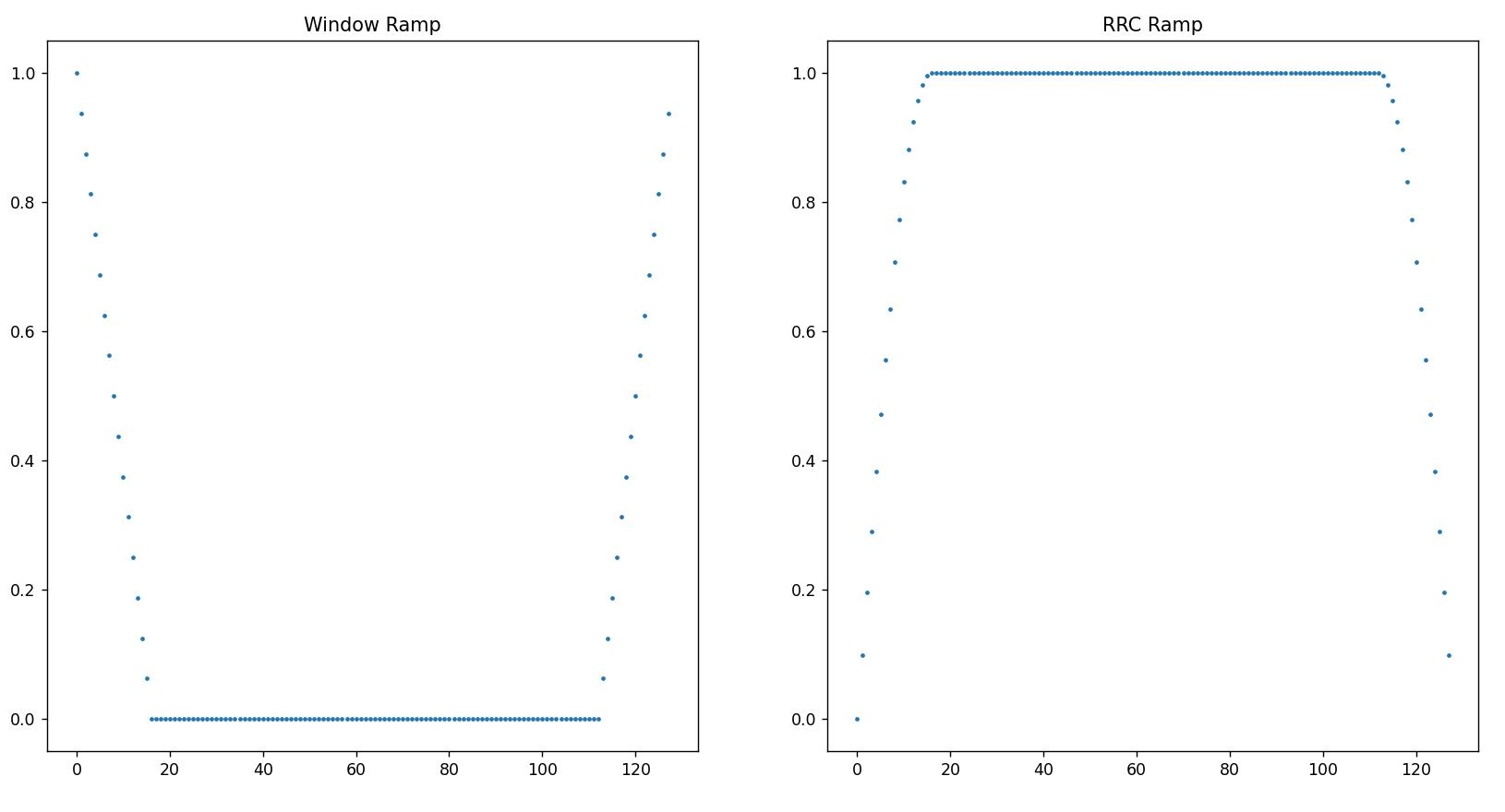 window_ramp 函数计算了一个梯形的窗口, calc_raised_cosine 对其计算了升余弦函数,最后计算平方根得到根升余弦函数。基本上长下面这样: