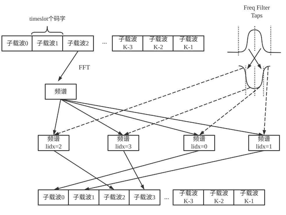画了个图还是好抽象…… 也就是在频域上一个子载波会占用 overlap 个子载波的带宽。这样各个子载波之间也是有混叠的,为了避免之间的互相干扰,我们需要去使用一个 RRC 滤波器来避免串扰。
