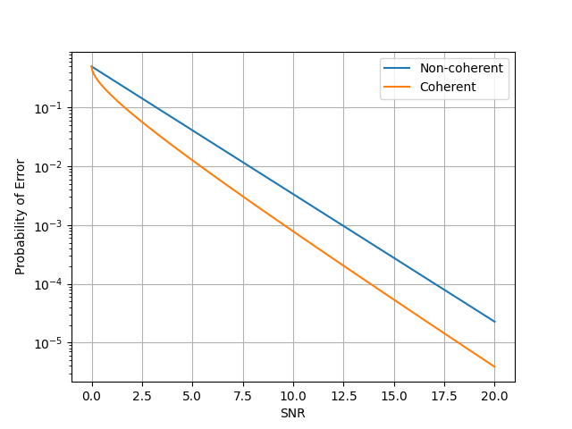 两者还是有比较明显的差距的,非相干解调的错误概率明显要高于相干解调的情况,不过这也是意料之中的,毕竟成本更低,实现也更加简单。