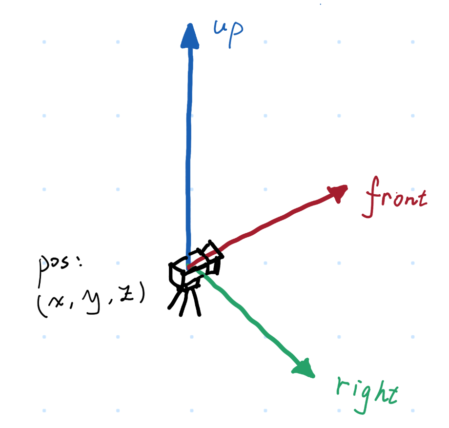 显然,我们仅仅依靠一个坐标是不能描述摄像机的状态的 —— 摄像机会在这个固定的位置上旋转,而且是异常灵活的旋转。我们至少需要确定摄像机的朝向和上方向,才能够固定摄像机的状态。