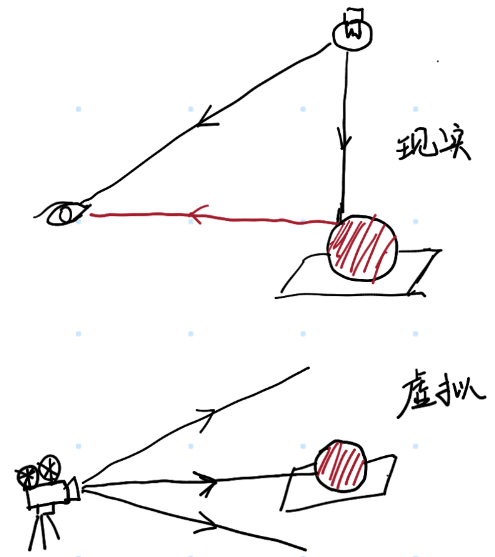 还是需要重新解释一下光线追踪到底做了什么,从在现实中,我们所看见的东西来自于光线经过了物体的折射、反射之后进入了我们的眼睛。而在模拟过程中,直接去模拟整个场景中的光线传播显然是不现实的 —— 一方面,需要模拟的数据量是非常可怕的,另一方面,整个环境中大部分的光线都是没有进入摄像机的。