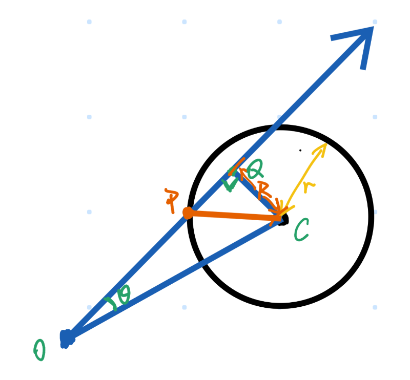 记光线起点为,方向向量为,球心为,记光线上离球心最近的点为(即)。记,根据余弦定理,有