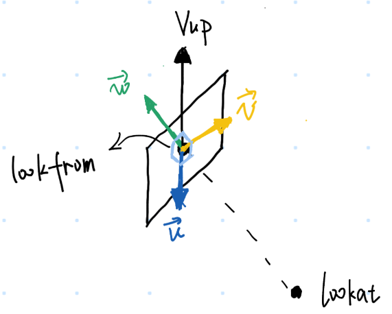 其中 lookfrom 为相机位置, lookat 为相机面向的点坐标, vup 是相机的上方向。这里的 vup 不一定要和矢量 lookfrom-lookat 正交 —— 为了便于描述,我们采用另外的一组矢量来描述相机状态。