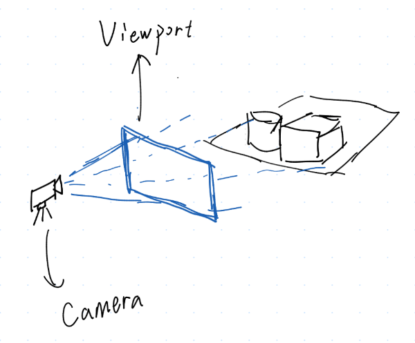 想象这样一个画面,一个摄影机正在拍摄一个场景 —— 摄像机的前面放着一张虚拟的幕布,摄像机所见的一切都投影在了这张幕布上。